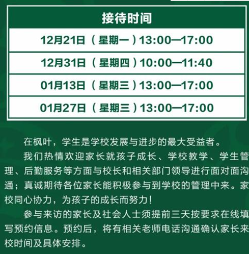 根据校区工作需要,重庆枫叶国际学校决定设立 “校长接待日”。通过这一举措,期待使学校管理进一步向多维纵深发展,家校更紧密,学生的成长更顺畅。本学期接待安排如下: