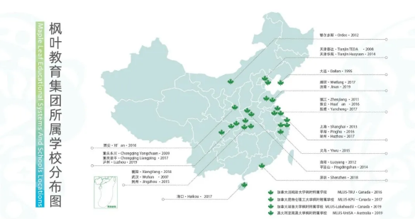枫叶教育集团作为中国国际教育领军者之一,1995年创建以来,目前已在中国大连、武汉、天津、重庆、镇江、洛阳、鄂尔多斯、上海、平顶山、义乌、荆州、西安、淮安、平湖、湖州、潍坊、盐城、海口、深圳、襄阳、泸州、济南、呼和浩特以及加拿大温哥华、桑德贝、甘露市、布罗克维尔、澳大利亚阿德莱德、马来西亚吉隆坡、新加坡国内外30个城市开办学校120所,在校生规模达到44000多人,中外籍教职员工7000多名,形成集外籍人员子女学校、幼儿园、小学、初中、高中为一体的多层次高品质国际教育体系,获得社会广泛认可。