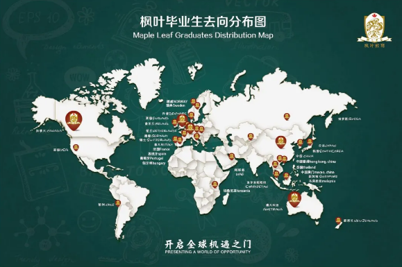 创立至今,枫叶教育集团已培养近1.9万名毕业生从枫叶走向世界,被全球30多个国家和地区的750所高校录取,包括美国斯坦福大学、芝加哥大学,英国剑桥大学、帝国理工大学、伦敦大学学院,加拿大多伦多大学,澳洲国立大学,新加坡国立大学和香港大学等。2020年7月,78%的毕业生被枫叶全球百强名校录取。