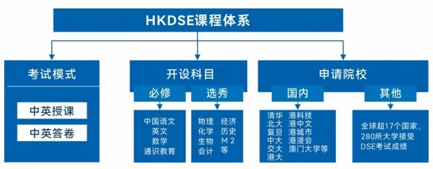 HKDSE,即香港高中生升本科的官方考试(Hong Kong Diploma of Secondary Education (HKDSE),也被称为“香港高考”,学校开设四年制DSE课程,其中*含DSE课程预科班,并组织学生参加由香港考评局主办的国际课程考试,作为全球唯一可用中文作答的国际课程考试,帮助学生轻松升入中国香港、澳门及新加坡以欧美主流国家的**高校。