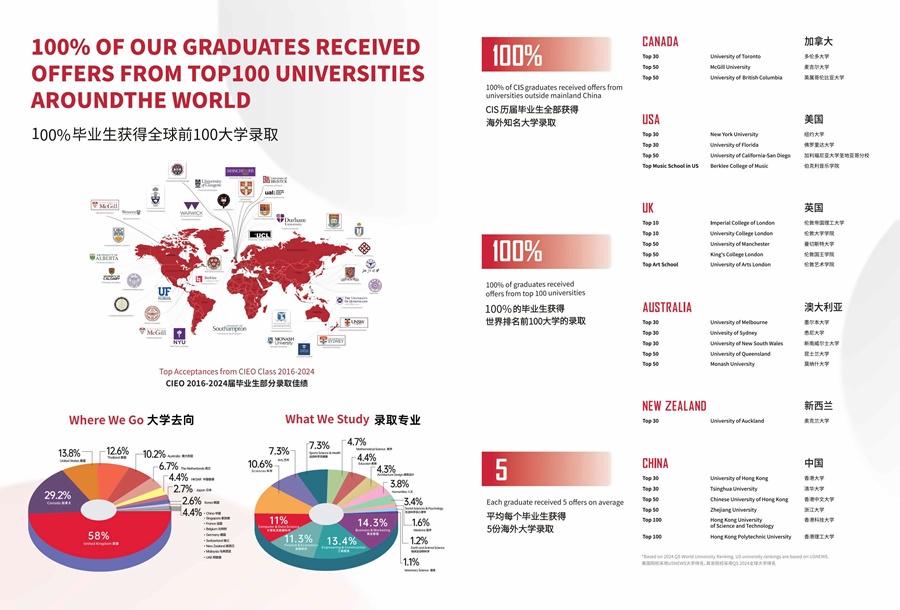 CIS拥有骄人的毕业生记录,根据2024年数据,CIS****高中毕业生升读至全球TOP100大学,其中73%升读至TOP50、58%升读至TOP30。