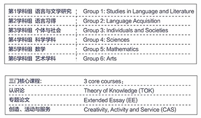 国际文凭大学预科项目(IBDP)的课程模式*含六个学术领域,它们围绕着一个核心部分。各学科的学习同步进行,学生需要学习一系列广泛的科目来代表所有的主要学科。学生需要学习六门科目(三门高级课程和三门普通课程)和三门核心课程。