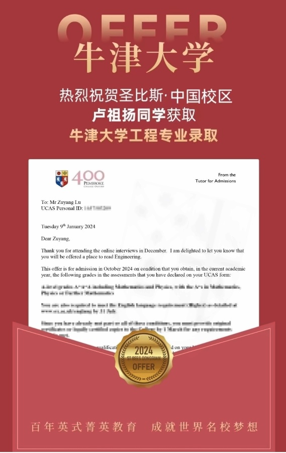 圣比斯·中国校区学子卢祖扬斩获了牛津大学工程专业本硕连读预录取!