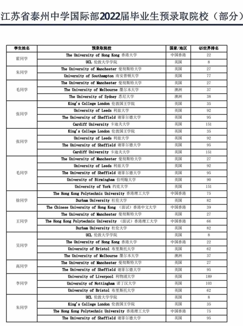 值得一提的是,在2022年申请季中,江苏省泰州中学国际部的毕业生再次取得了傲人的成绩,众多海外名校捷报频传!霍同学、吴同学两名同学收获香港大学免面试预录取,徐同学、朱同学等六名同学收获香港地区大学的面试邀请!