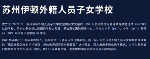 苏州伊顿外籍人员子女学校成立于2003年,作为一所IB学校,伊顿提供从PYP、MYP到DP的全学段国际课程。此外苏州伊顿外籍人员子女学校还是一所剑桥IGCSE学校以及爱丁堡公爵奖中心。学校为学生提供了许多探索和挑战的机会,也为同学们探究式学习提供支持。2021年新成立的Middleton国际部,采用IPC、IMYC、IGCSE及A Level课程设置,为更多本地家庭提供了高性价比的国际教育。